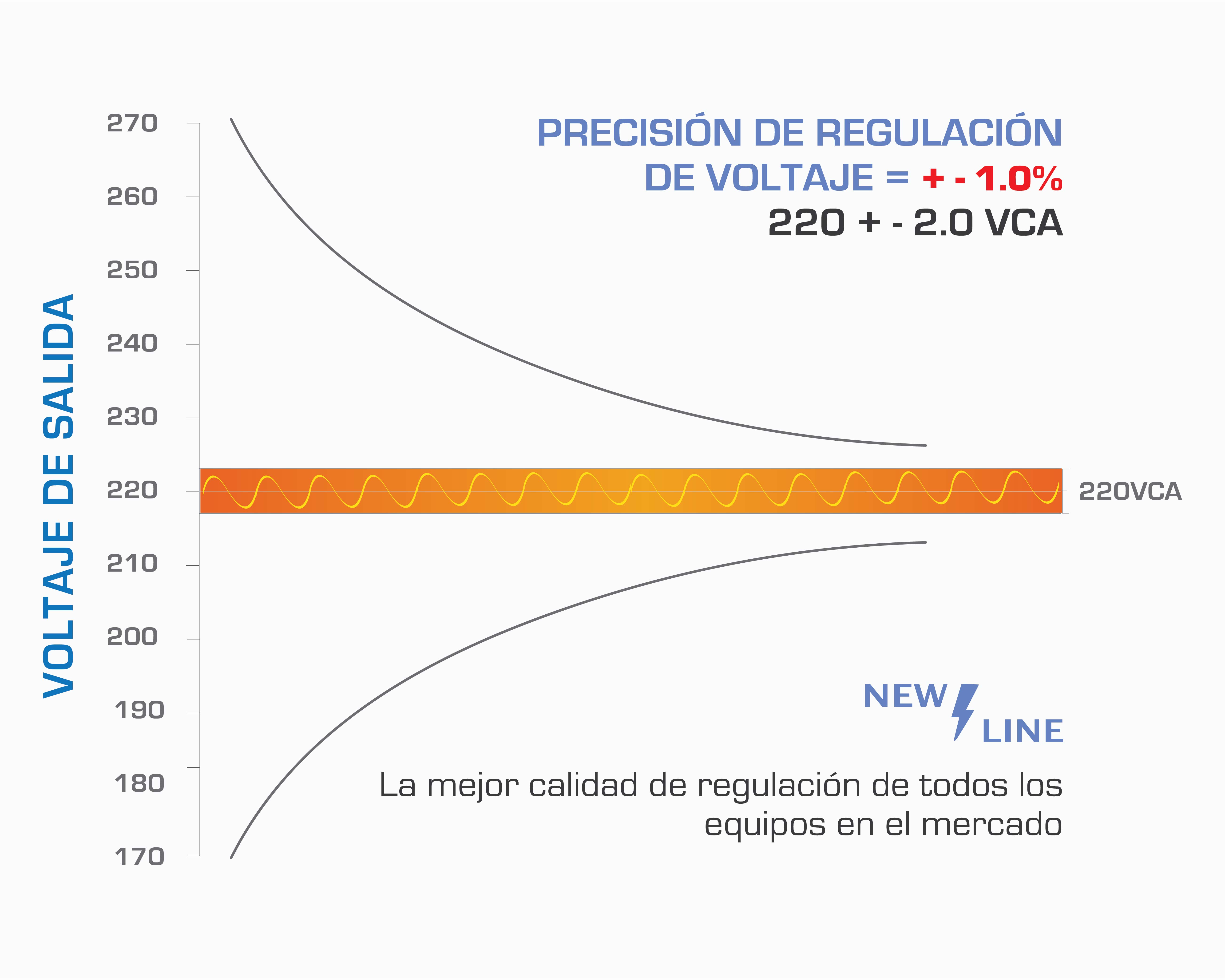 Amplio Rango de Corrección: Un regulador de voltaje industrial New Line corrige todas las variaciones de voltaje en el rango de 185 V a 255 V (+-16% del voltaje nominal) en sistemas 220v. Adicionalmente podemos fabricar reguladores industriales con campos de regulación de voltaje de hasta +- 30% para maquinaría eléctrica expuesta a variaciones de voltaje aún mayores.