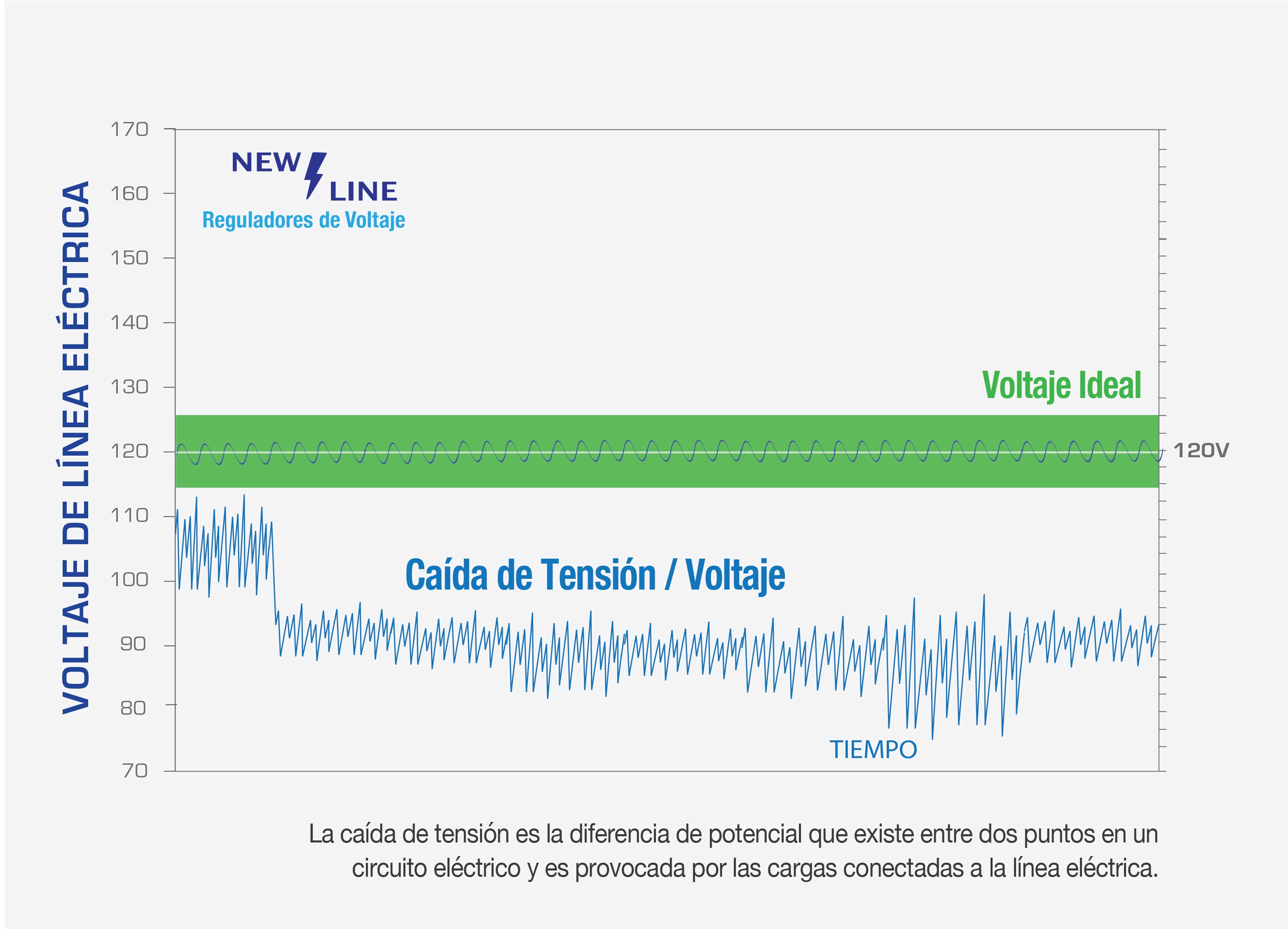 La caída de tensión eléctrica se define como la diferencia de potencial que existe entre los dos extremos de una línea eléctrica. En un conductor la caída de tensión se mide en volts y existe en función del largo y de la resistencia del medio de condición eléctrica. A mayor distancia de la fuente de voltaje y mayor resistencia del conductor eléctrico existe una mayor caída de tensión y voltaje bajo.
