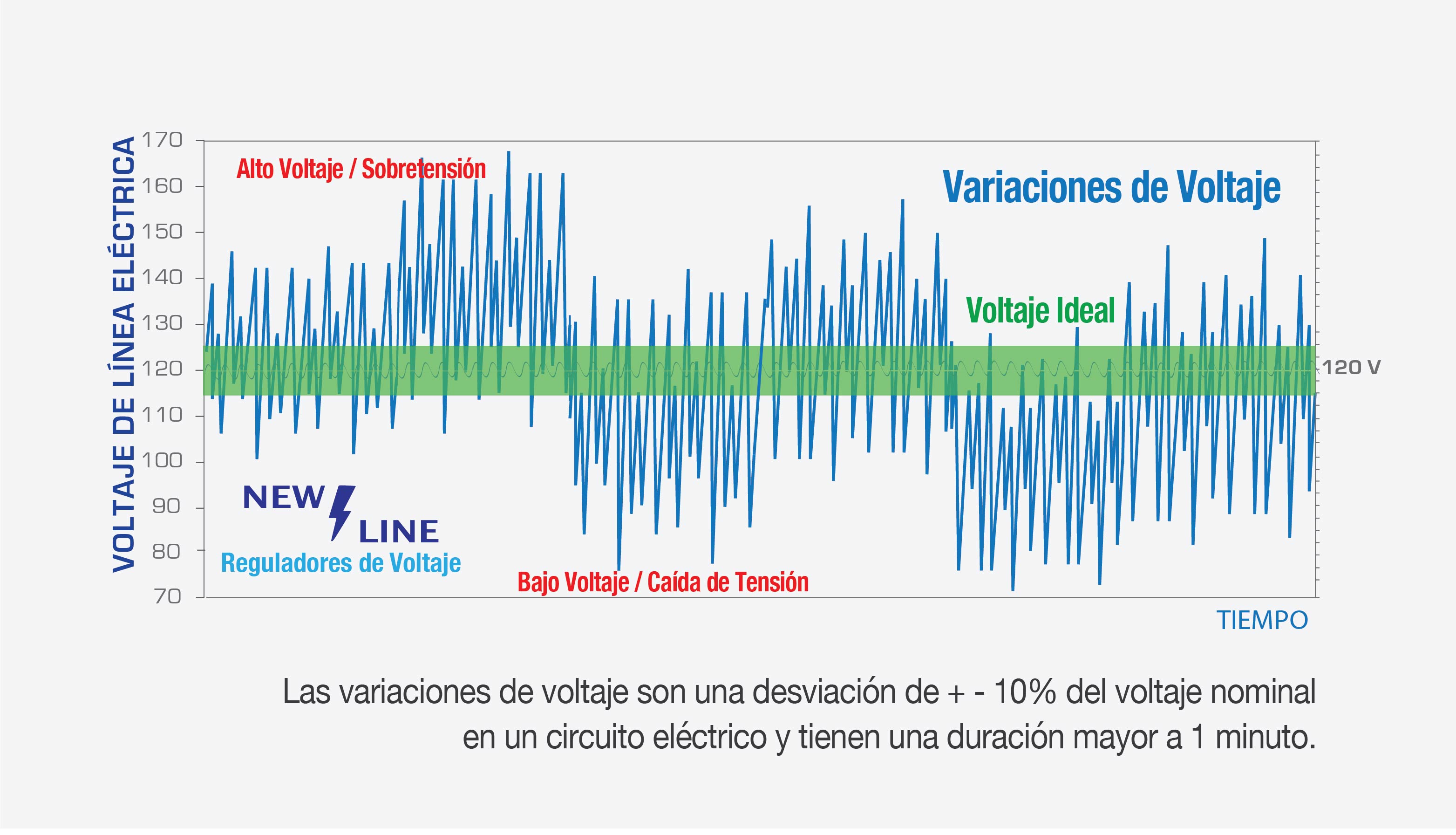 Las variaciones de voltaje son un fenómeno en el cual el voltaje de una línea eléctrica es inestable y alcanza valores mayores o menores al 10% del voltaje nominal / ideal. La variación de voltaje es un fenómeno dinámico y el voltaje de la línea puede variar de acuerdo con el horario, lugar, tipo de carga o condiciones de la línea eléctrica. En muchas situaciones es común que el voltaje tenga una caída de tensión en horas pico debido a la sobre-demanda de energía eléctrica, mientras que al disminuir la demanda llegue a existir un sobrevoltaje / sobretensión en la línea. De acuerdo con diferentes estudios las variaciones de voltaje eléctricas son las responsables de mas del 85 % de las fallas en los sistemas eléctricos y electrónicos. Este tipo de fenómeno es extremadamente frecuente en ambientes industriales, comerciales y domésticos en donde la calidad del servicio eléctrico es pobre debido a una sobrecarga de la red eléctrica. El método más común para corregirlas son los equipos de regulación de voltaje los cuales monitorean y mantienen el voltaje de la línea estable de manera permanente.