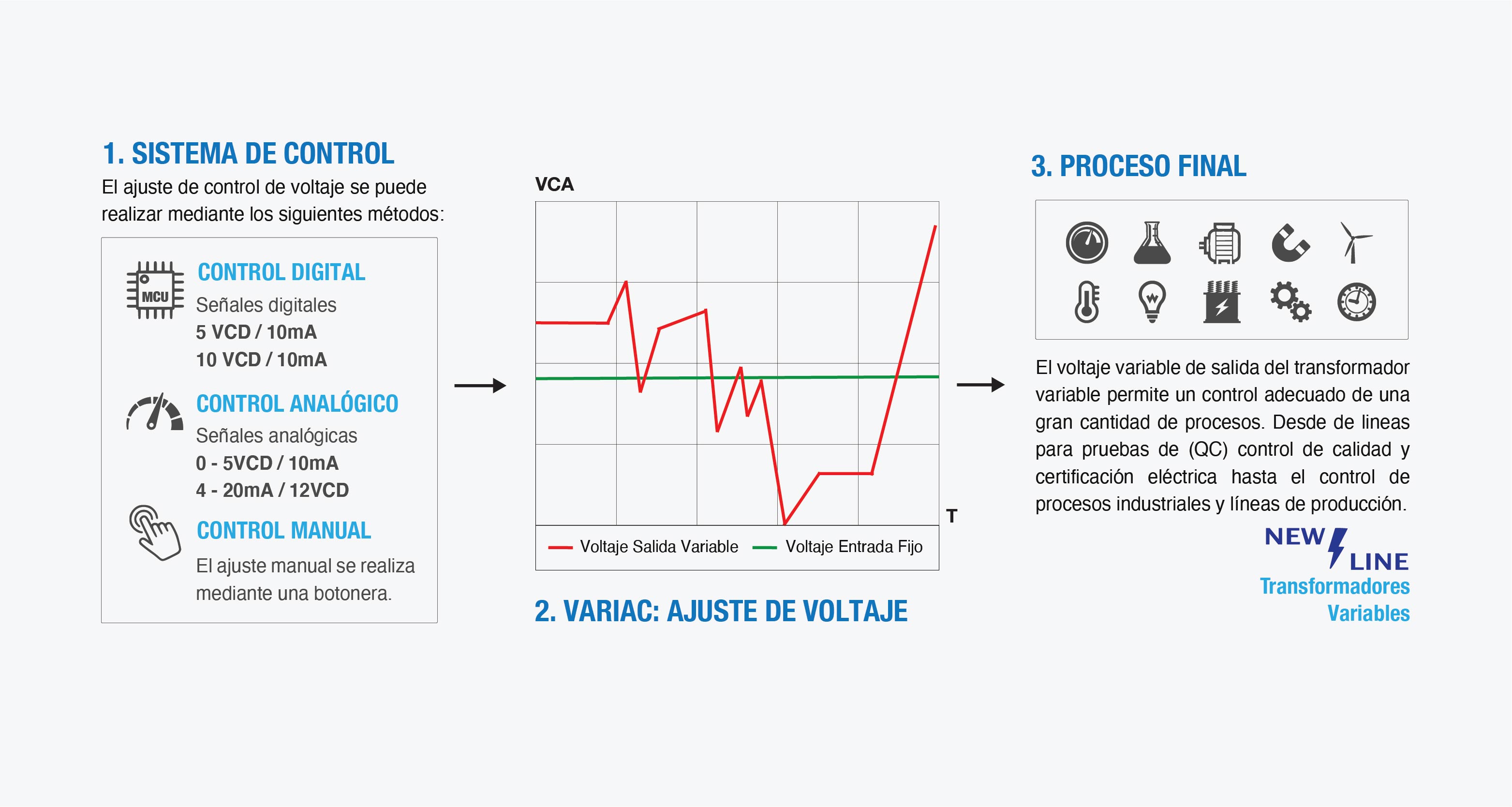 Los transformadores variables New Line cuentan con un funcionamiento simple y confiable, diseñados con enfriamiento en seco o aceite dieléctrico. Proveen una excelente calidad de energía, una onda de sinusoidal constante, con una capacidad da carga al 100% en cualquier posición de voltaje de salida. Los variadores de voltaje New Line han sido diseñados específicamente para uso y aplicaciones en procesos industriales.
